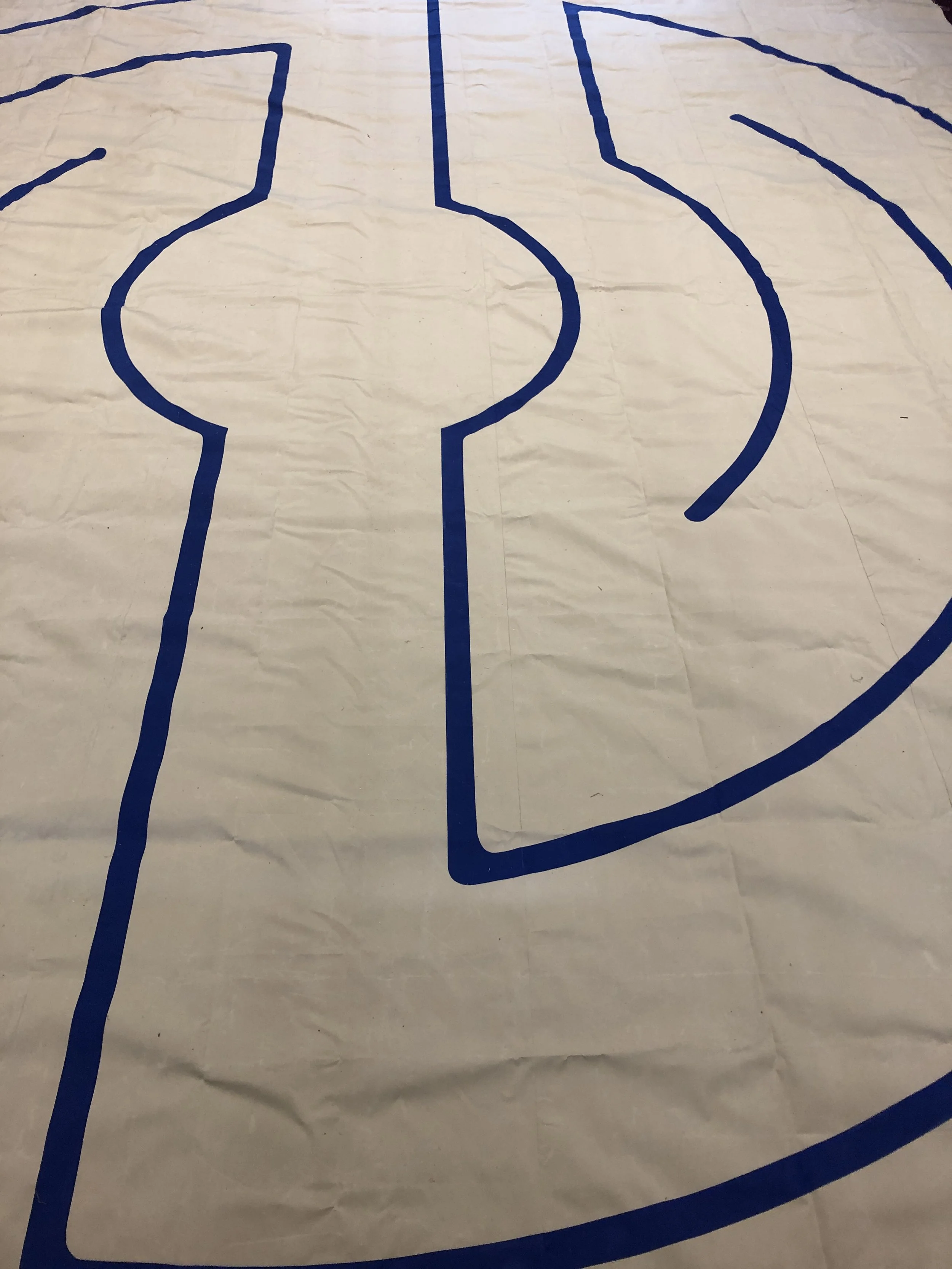 24 ft. Square custom portable labyrinth on specialty fabric, hemmed perimeter, blue paint on beige fabric, 3-circuit pass-through design. Accessible for wheelchairs and walkers and good for social distancing.